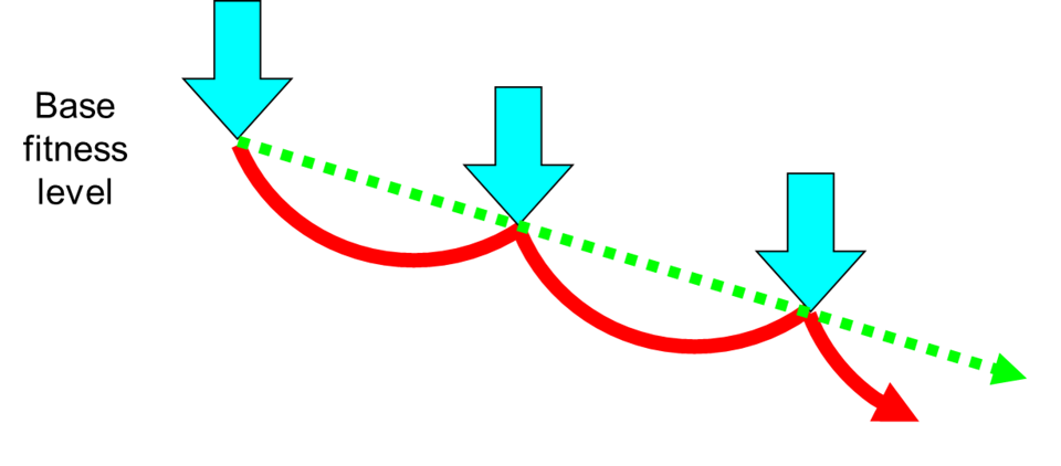Take a look at these two charts below. The first shows that physiologically your fitness gain actually occurs during the SLOW RECOVERY RUN. The second shows what happens if a runner simply continues to stress their body without the proper aerobic runs to facilitate recovery. It’s a downward spiral to illness and injury and may cause you to take a break in your training.